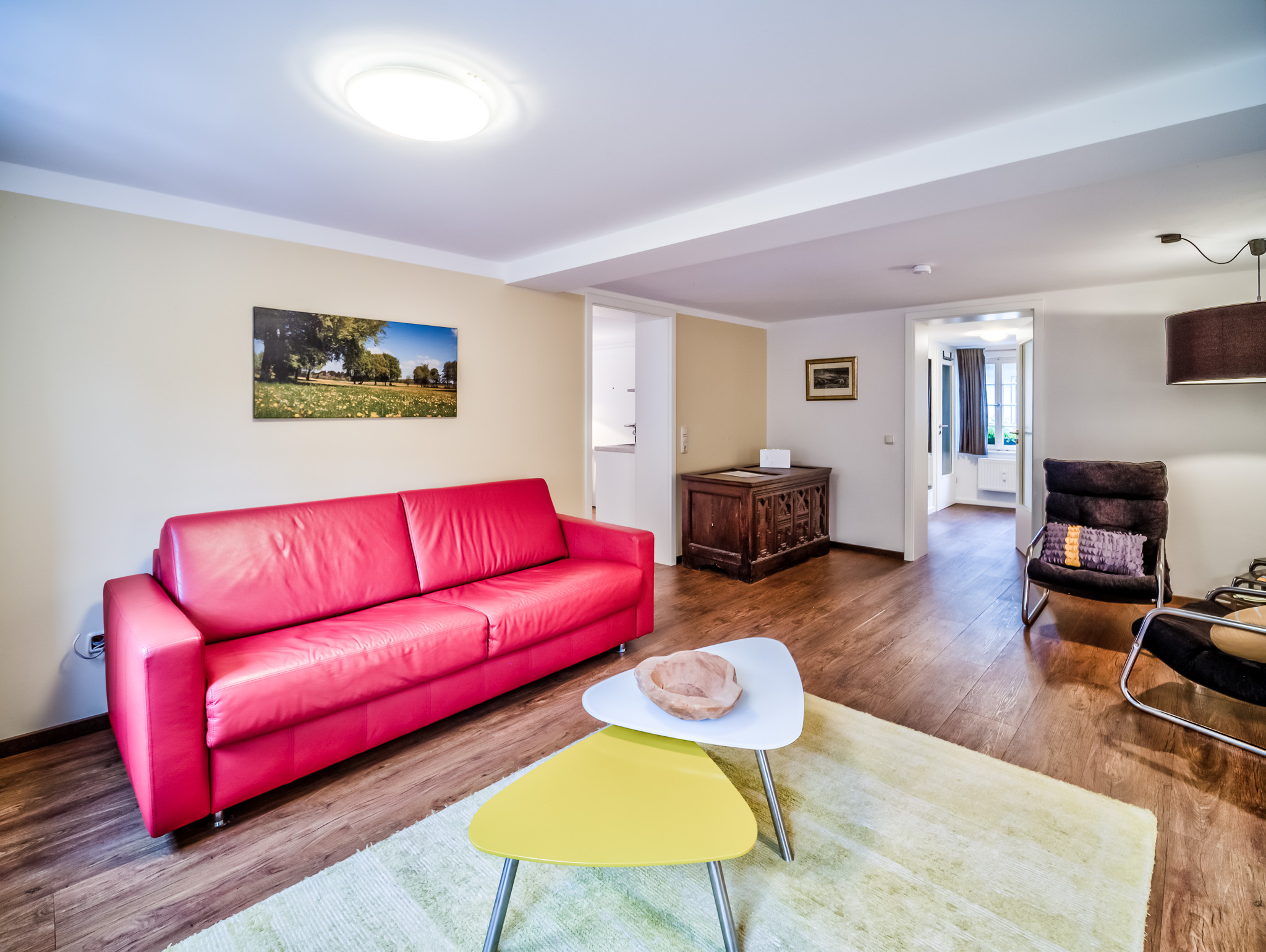 Wohnzimmer mit roter Lederschlafcouch und Kaltschaummatratze (160×200). SAT TV, Sonoro Stereo Musiksystem, Spielkonsole (PS3) mit Blueray, CD und DVD Player, WLAN. Tageslichtbad mit Echtglasdusche und Designbadmöbeln.